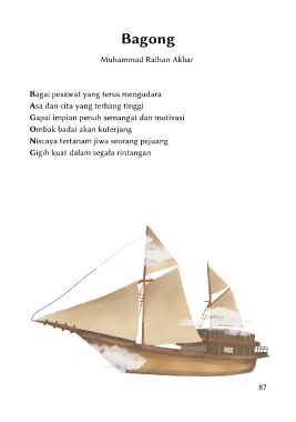 Bagong Muhammad Raihan Akbar Bagai pesawat yang terus mengudara Asa dan cita yang terbang tinggi Gapai impian penuh semangat dan motivasi Ombak badai akan kuterjang Niscaya tertanam jiwa seorang pejuang Gigih kuat dalam segala rintangan 87