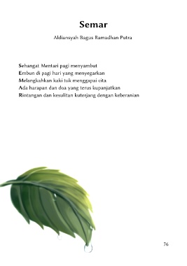 Semar Aldiansyah Bagus Ramadhan Putra Sehangat Mentari pagi menyambut Embun di pagi hari yang menyegarkan Melangkahkan kaki tuk menggapai cita Ada harapan dan doa yang terus kupanjatkan Rintangan dan kesulitan kuterjang dengan keberanian 76