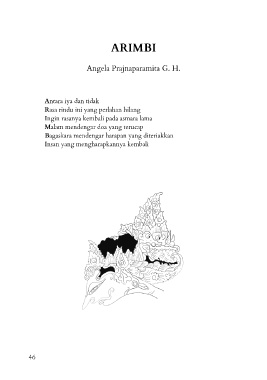 ARIMBI Angela Prajnaparamita G. H. Antara iya dan tidak Rasa rindu ini yang perlahan hilang Ingin rasanya kembali pada asmara lama Malam mendengar doa yang terucap Bagaskara mendengar harapan yang diteriakkan Insan yang mengharapkannya kembali 46