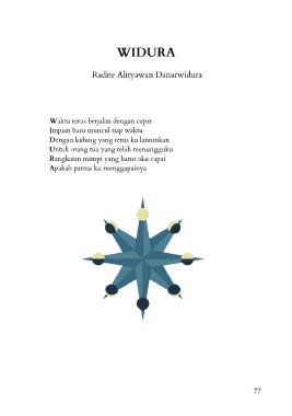 WIDURA Radite Alityawan Danarwidura Waktu terus berjalan dengan cepat Impian baru muncul tiap waktu Dengan kidung yang terus ku lantunkan Untuk orang tua yang telah menungguku Rangkaian mimpi yang harus aku capai Apakah pantas ku menggapainya 77